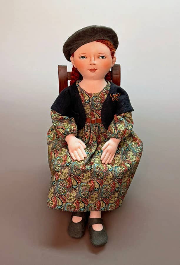 Hello Reader, Now that we're well into 2026, it's time to get a wiggle on and start making dolls for ODACA Day this summer. I'm looking forward to visiting New Orleans again, and will be taking a couple girlfriends with me, one of whom will be arranging our various excursions (music venues, walking tour, swamp/boat adventure, cemetery visits...) In the past week I made a new doll - partly because I was procrastinating getting a start on my luncheon centerpiece steampunk doll (daunting), and I wanted to knock one out, revisiting a doll design familiar to me. In fact, I have a little stack of my doll patterns with plans to make at least one of each for the sales room this summer. This latest doll is "Amity," made from my 2012 pattern but reduced in size to 78% of the original and with a few modifications. I've given her a shrug up-cycled from a merino wool cycling jersey. I made her a leather belt. She wears wool felt mary janes and beret. Her yarn hair is hand-stitched to her head - a process that takes (me) many hours. I'd planned to give her a necklace, but didn't have anything suitable in my stash. I did, however, find a cloisonne butterfly pin that matched the dress colors perfectly. I'm quite happy with her.